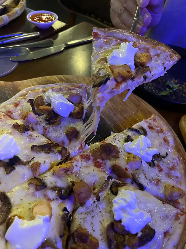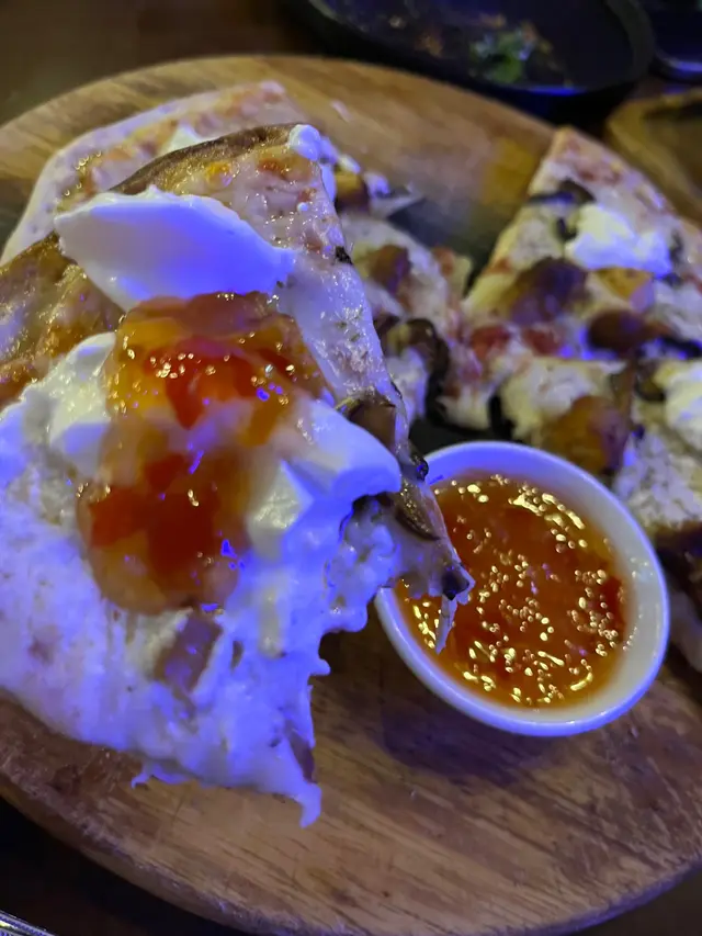 呢個pizza 有mozzarella cheese 🧀 之外仲有sour cream😍 因為黃豆唔食辣 所以叫廚師🧑🏻🍳另上泰式辣醬