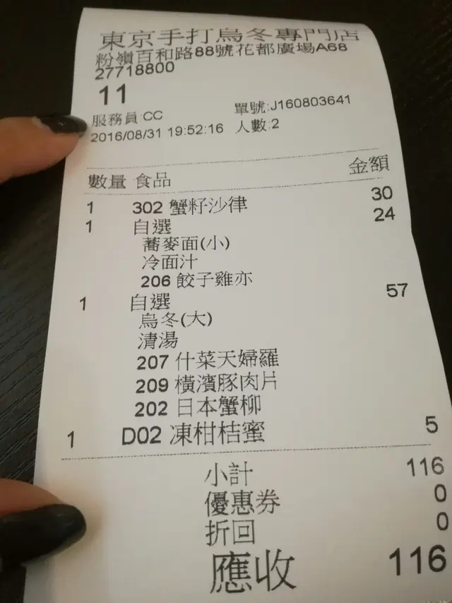 簡便日食 chiu_zone等级42016-09-10563 浏览 关注 天氣悶熱,晚餐都唔想食得太多。 清清地食日本嘢啦~哩間烏冬店位於屋苑商場,人流唔多,平日晚餐時間都唔洗點等位。1類似車仔面食法,揀烏冬或蕎麥麵,湯麵或冷麵,再揀餸。蕎麥麵麥味唔算重,吸收冷麵汁,再加少少wasabi一齊食,易入口又開胃。什菜天婦羅係洋蔥,薯仔同紅蘿蔔絲,即叫即炸,非常香口。蟹子沙律$30蟹子沙律非常好食,生菜絲加少許青瓜絲,已經撈埋醬,配蟹子鹹香,味道好過好多連鎖餐廳。哩個價錢,根本唔會有咩要求,中上味道,非常滿意 以上食记乃用户个人意见 , 并不代表OpenRice之观点。1分享簡便日食 東京手打烏冬專門店 https://s.openrice.com/QrLT09bqe00检举 张贴 评分4味道4环境4服务4卫生4抵食推介美食蟹子沙律$30用餐途径堂食人均消费$60 (晚餐)