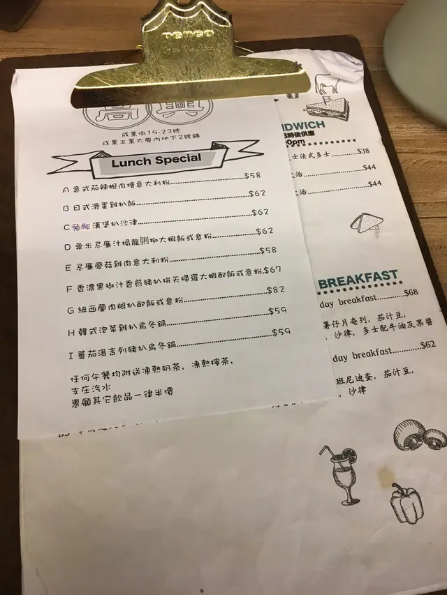 兩人坐下,便為我們送上餐牌, 當時還有lunnch set, 但我們想吃的都不包含在lunch set 裡, 所以我們散點了兩杯飲品和3樣食物。 散點的食物,在餐牌上雖然寫著3pm 後才有,但經過詢問下,因為星期天,所以我們於2時半也可以點了。