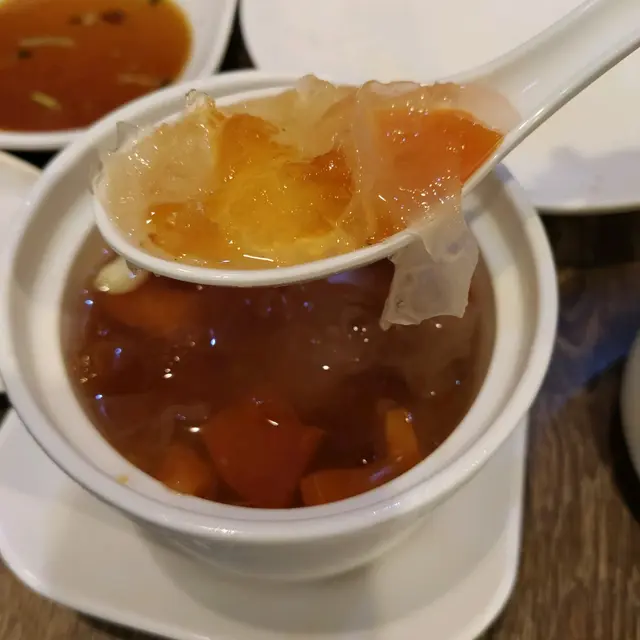 用料非常多。除左雪耳、木瓜、桃膠仲有百合等。桃膠唔會煲到溶晒,所以整體唔會太漿,幾好。可惜的是味道幾淡,冰糖味好少唔甜,香味亦唔多覺有,係靠木瓜少少嘅甜味撐起。