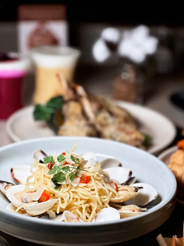 意粉掛滿濃郁白酒蜆汁,滿滿酒香和蒜香。