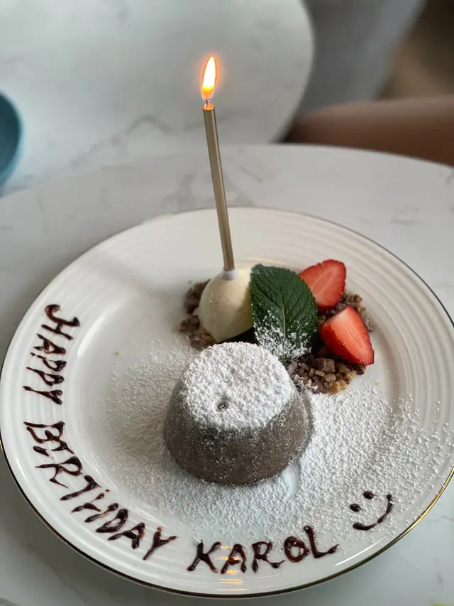 甜品是朱古力心太軟配雲呢拿雪糕配上生日寫字~
