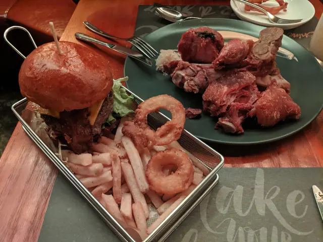 特級安格斯漢堡和薯條擺在一個平底筲箕上菜,漢堡相當大件,薯條份量亦不少,即點即炸,香脆可口,點著茄醬吃,減低熱氣和罪惡感。漢堡足料,主角當然是特級安格斯,