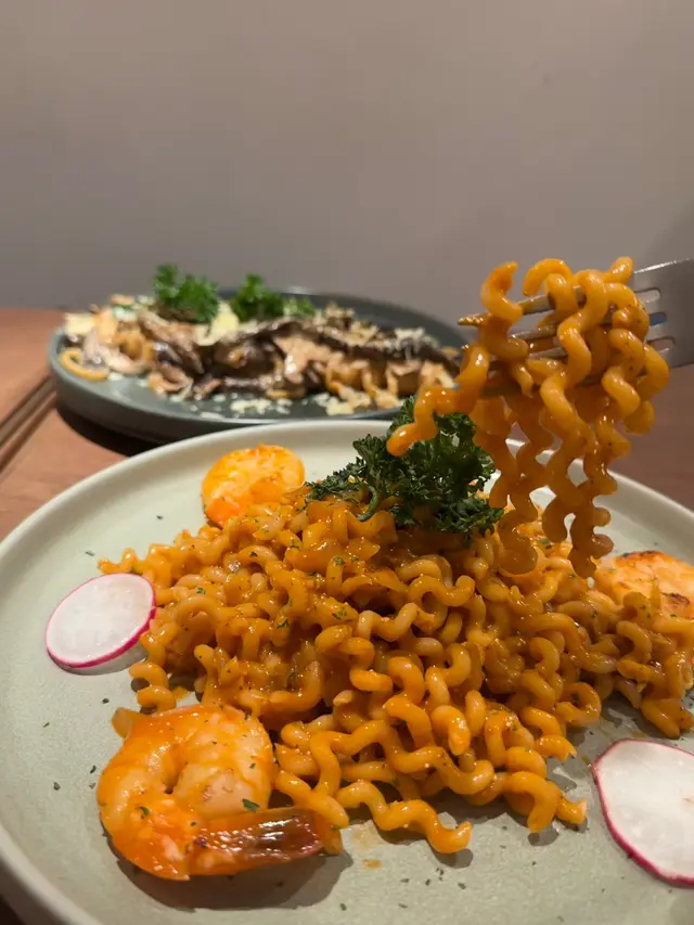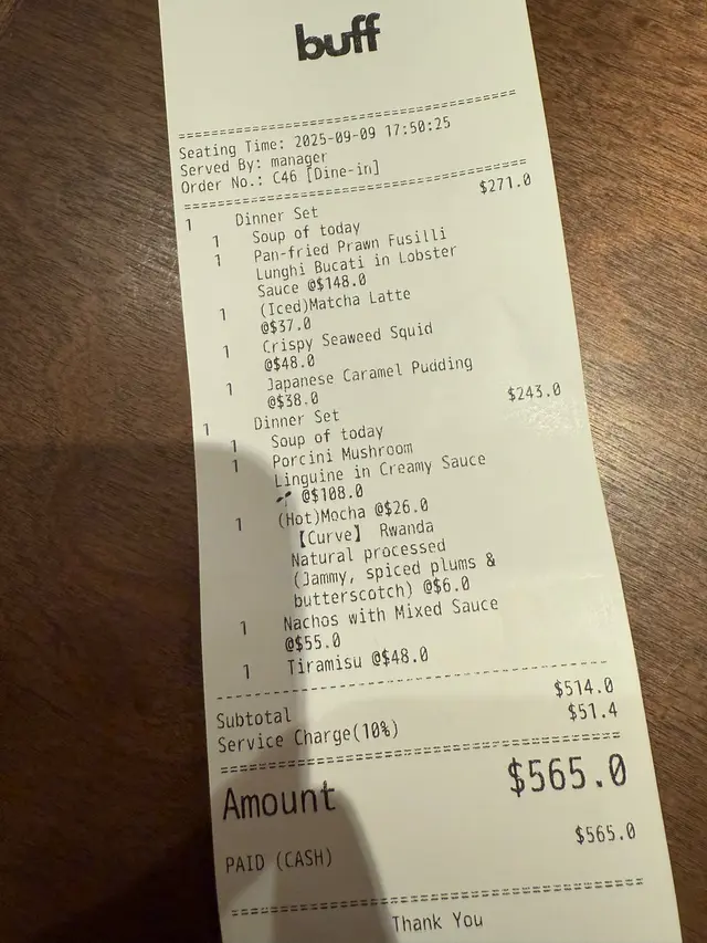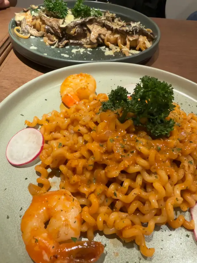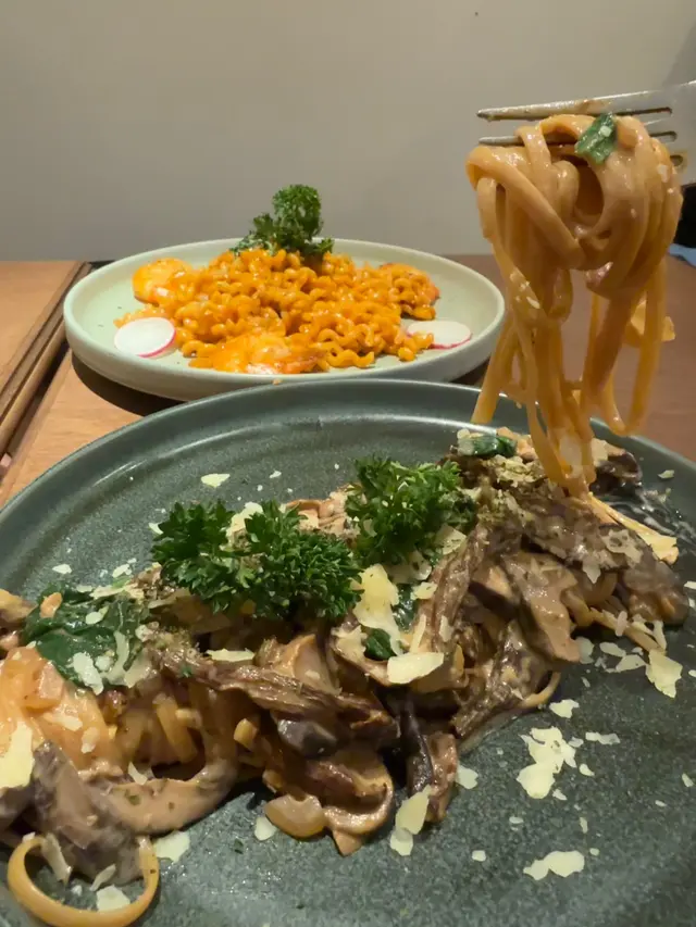 去到餐廳門口睇吓有咩食先啦,原來有晚市套餐,附送餐湯、熱洋甘菊茶,仲可以加錢食甜品或小食。咁我唔使諗啦,就梗係試吓香煎海蝦龍蝦汁卷卷意粉 ,第一次食真係非常有驚喜,除咗味道濃郁,龍蝦汁配埋大大隻海蝦,最正梗係卷卷意粉,好掛汁,而且口感好好,真係食到停唔到口。另外叫咗一碟惹菌意粉,味道比較清淡但好重菇味,不過呢間餐廳整嘅意粉真係好高質,軟硬度剛剛好,我鍾意比較有咬口嘅意粉,真係做得好出色。