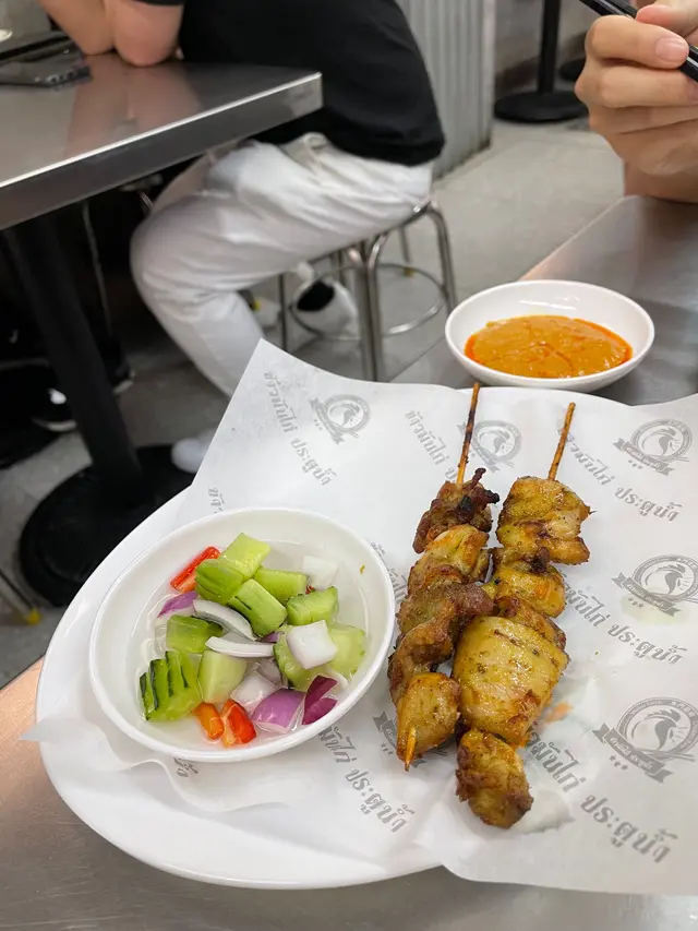 入到去坐低店員就俾咗QR code我哋自己落單,好快就嚟咗個胡椒湯,睇落清清地但又好夠味,朋友就order 左雙拼雞飯即係海南雞加炸雞lunch set (估唔到假日都有lunch set 又幾抵),海南雞好滑而雞油飯都出色,香得黎唔太油,反而炸雞麻麻,下次可以淨叫海南雞飯。 另外叫左雞肉串燒,點埋個沙嗲醬好正,好入味又唔乾。