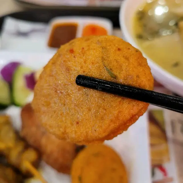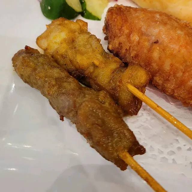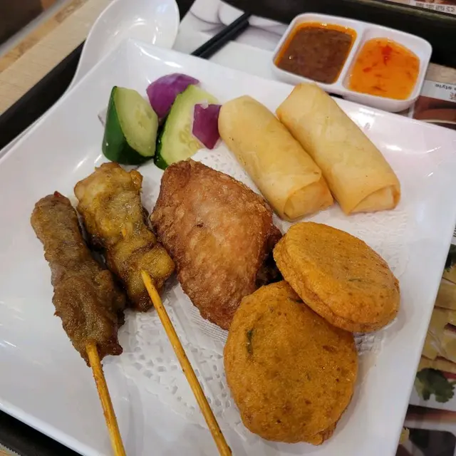 小食拼盤包括沙嗲,魚餅,春卷及雞翼,38元就能吃到這堆小食,頗化算呢。沙嗲蠻有厚度,表面烤至微焦,香氣環繞鼻腔,沙嗲肉質嫩嫩的,沾上花生沙嗲醬更能提升沙嗲滋味。
