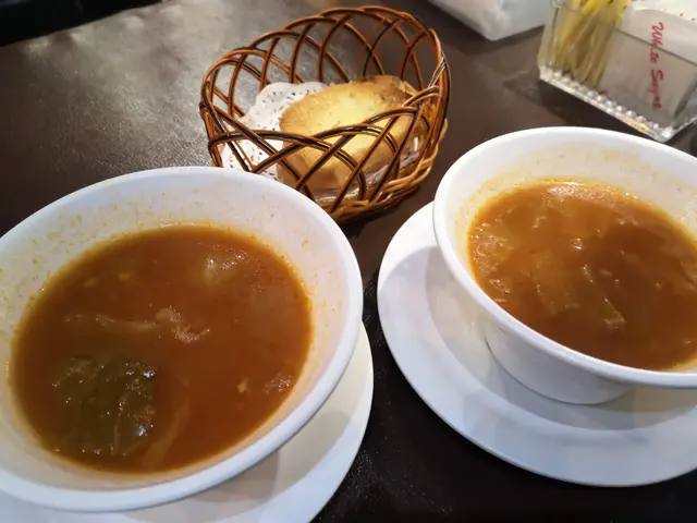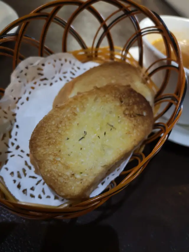 鐵板餐包括餐湯/沙律和飲品。 雜菜湯配蒜蓉包 👍 平日一至五更免費升級飲品。