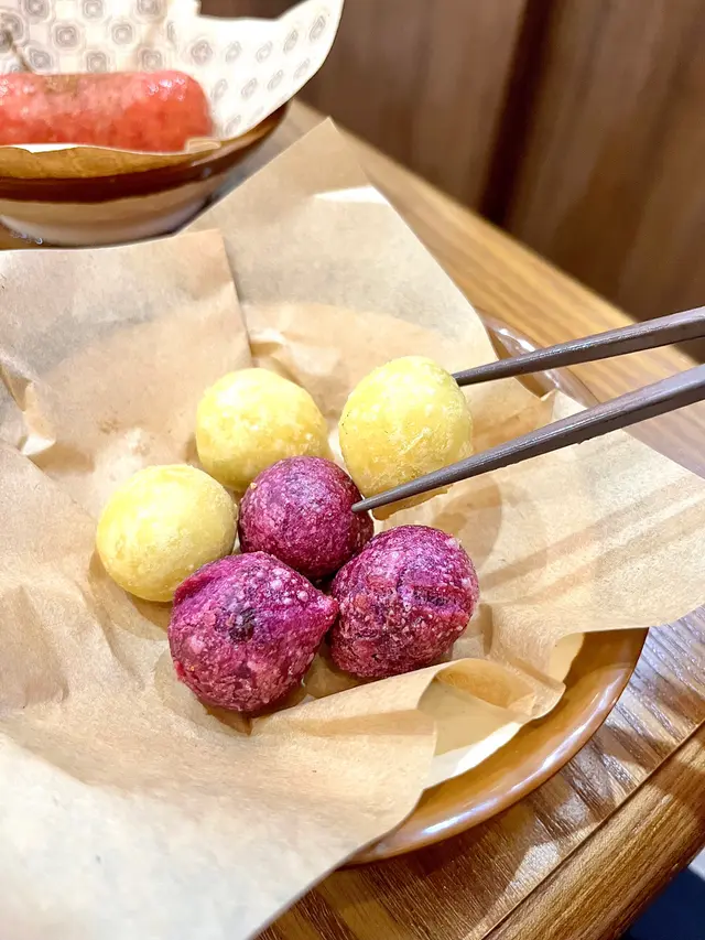 Q Q球口感煙韌👄有紫薯同番薯口味,紫薯外皮包住番薯蓉,而番薯外皮包住紫薯蓉,甜度適中👍🏻