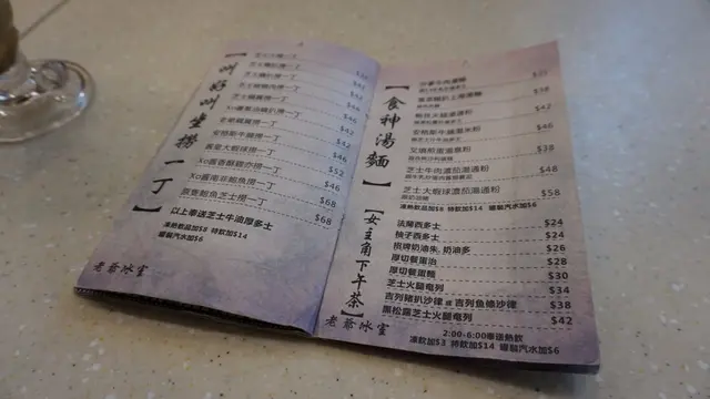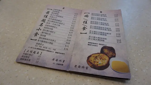 友人提過,原本的冰室是只賣小食及飲品,沒有正餐可吃的。但不意外地,近年開的冰室已經有齊小菜飯粉麵,這兒亦然。餐牌記載的餐點款式多樣,不只有平常大路的奶油多或炸脾沙律等等。就算是正餐,也有不少中西合璧的有趣配搭,例如黑松露海皇炒飯。飲品方面,就有什麼馬卡龍華田朱古力之類,沒有想過也沒有嚐過如斯配搭啊。