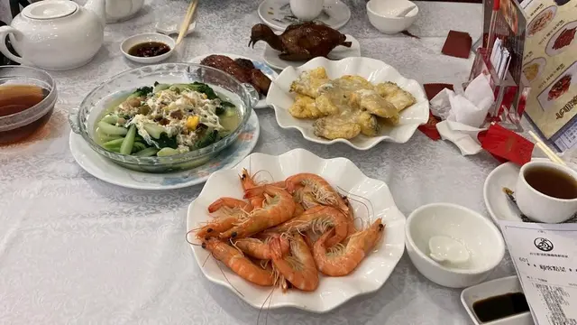 分別點左份海鮮孖寶B餐(白灼海蝦半斤+金銀蛋浸時蔬再送蜜汁叉燒皇細),粟米龍躉班塊,招牌燒乳鴿。