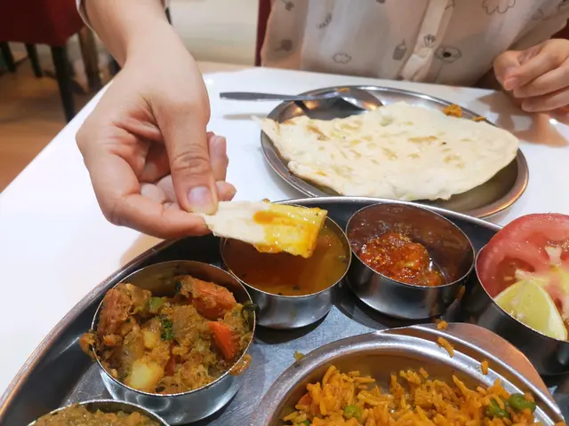 我地將個naan搣成細細塊逐個sauce試