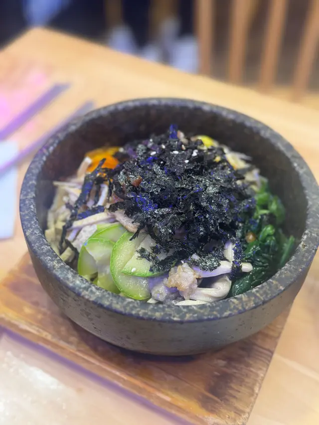 真心推薦!熱辣辣嘅石鍋上枱,飯底係紅米飯,有滿滿蔬菜。店員提醒要趁熱拌勻。一撈起就見到超邪惡嘅芝士拉絲效果,視覺效果滿分!牛肉用韓式辣醬炒得香濃,加上泡菜、紫菜、蔬菜等配料,口感豐富。最正係飯焦嘅部分,金香脆口,同軟綿嘅芝士形成強烈對比,食到最後一啖都係咁好味。