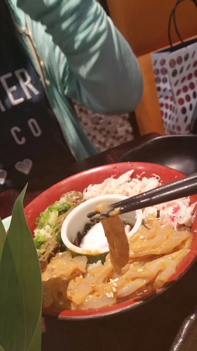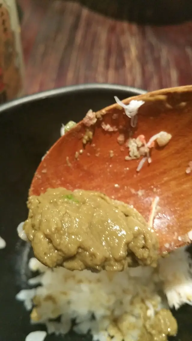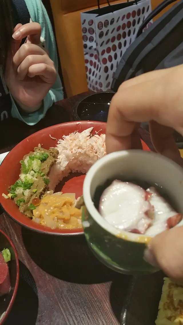揭開上層的碗,下層原來另有乾坤,原本腹黑的我只為二段丼底層一定「冇咁截」,但這個中間是八爪魚片,圍著有滿滿的蟹膏、蟹肉和海膽魷魚。都是相對貴價海鮮,感覺是意料地落足本,即使兩個人share食亦夠分。個人喜愛海膽魷魚的咸鮮和潤滑彈牙的口感,至於蟹膏、蟹肉亦是新鮮貨色,蟹肉層次分明沒有「粉」感,很好。