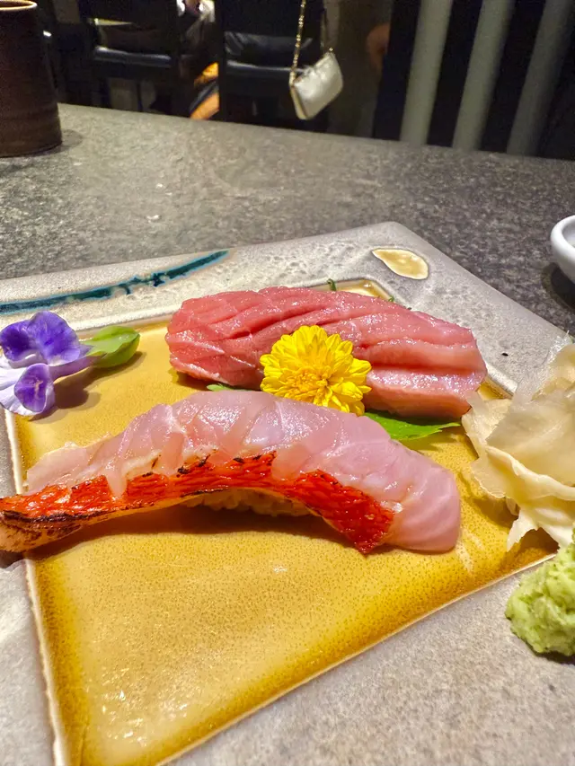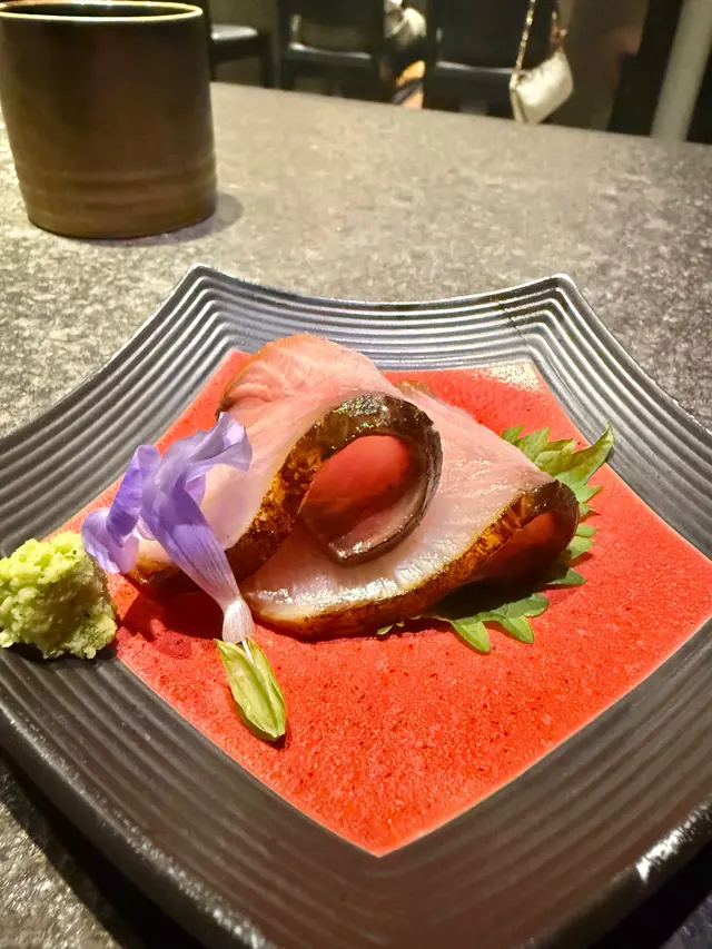將薄切真鯛片捲住甜蝦他他,配上柚子醋一齊食,不單止擺盤精美,味道都十分之夾。