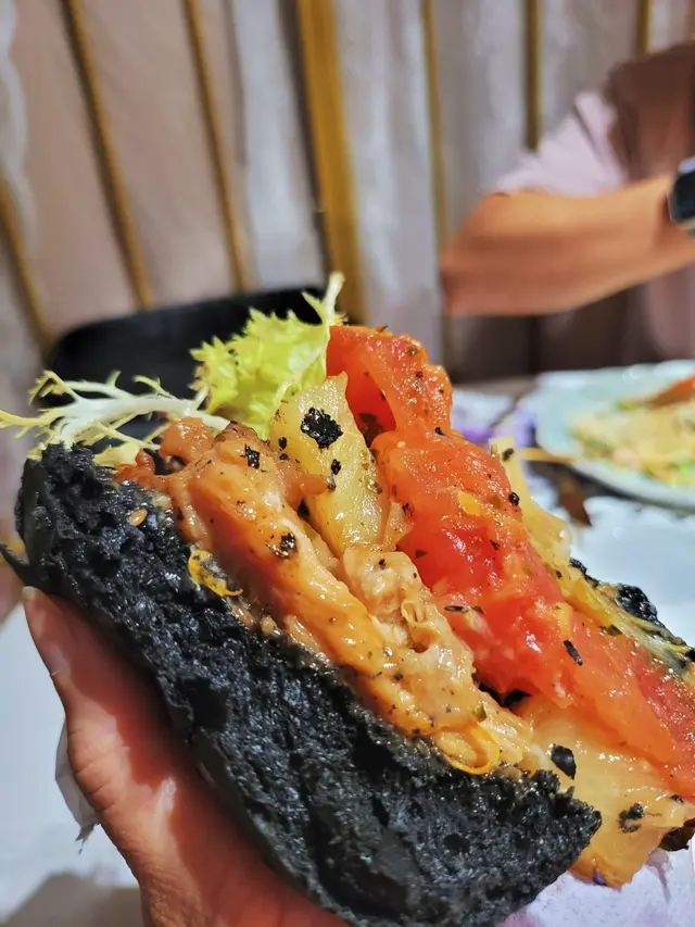 黑色漢堡甜甜的,外皮超級鬆脆,照燒雞扒嫩滑多汁,切開時仲見到油份流出嚟,配上沙律同三角脆片,整體上打卡一流,份量十足。