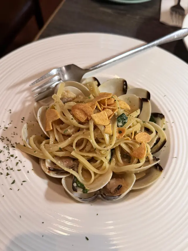 意粉上面灑咗一啲蒜片 整體蒜味好濃 而且蜆肉嘅份量好充足 唔會好多沙 意粉食落好掛汁之餘 唔會煮得過淋 食落有咬口 不過意粉煮得油咗少少🤏🏻