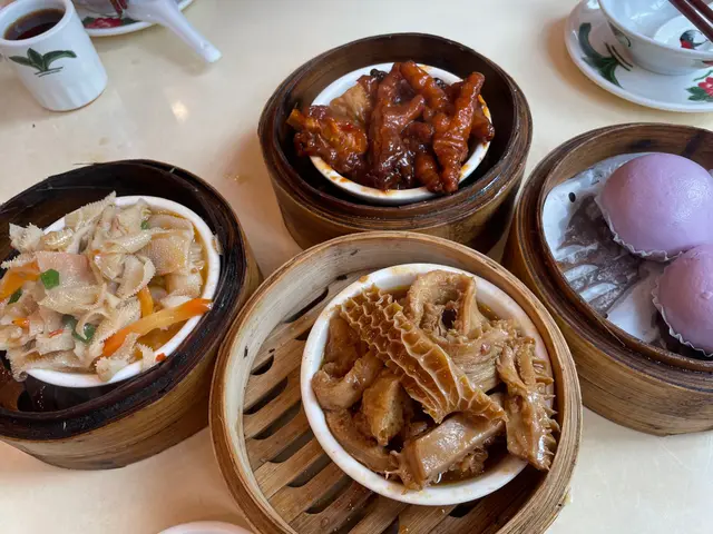老馮茶居係行懷舊路線,啲裝修好有心思同時呢到好多點心都好有特色。我哋今次四人叫咗十個點心/飯,非常滿足。分別係鮮蝦腐皮卷、咸水角、流沙芋泥包、鮮蝦腸、 XO醬蘿蔔糕、沙嗲金錢肚、豉汁蒸鳳爪、薑蔥牛柏葉、小籠包同埋梅菜肉餅飯。