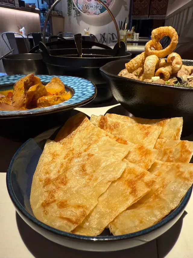 香酥餅蘸上微辣嘅黃咖喱汁,已經好美味,配埋爽口嘅豬頸肉,零捨好味😋