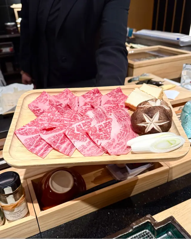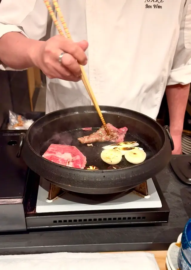 壽喜燒用上宮崎A4和牛嘅肉眼位同西冷位,頭兩片肉眼和牛肉先以關西風去烹調, 先以牛肪起鑊