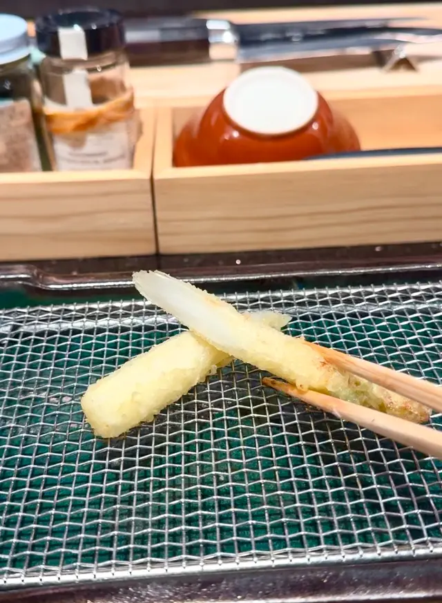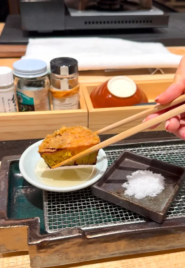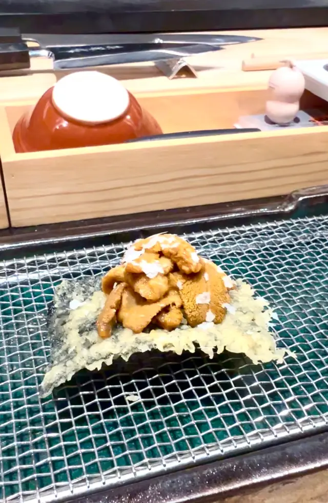 北海道馬糞海膽非常鮮甜,加上酥脆嘅紫菜天婦羅味道超夾!師傅喺海膽面頭再灑上以米與鹽結合而成嘅淡雪鹽,更提升了整體味道層次😆!