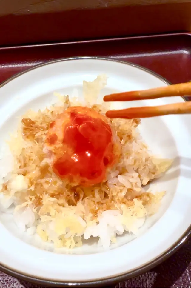 先將蛋黃炸成天婦羅,放上白飯上,