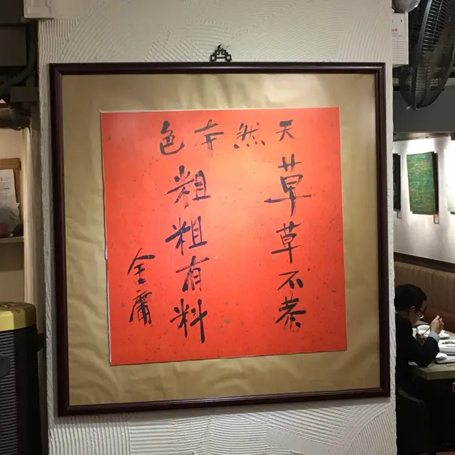踏上閣樓樓梯之前又有新發現,柱子上掛了另一幅裝裱題字,題字者名氣更響更大:「天然本色  草草不恭  粗粗有料   金庸」。實在想像不出查良鏞先生如何與「粗菜館」拉上任何關係,估計都是借助蔡瀾先生的關係吧?