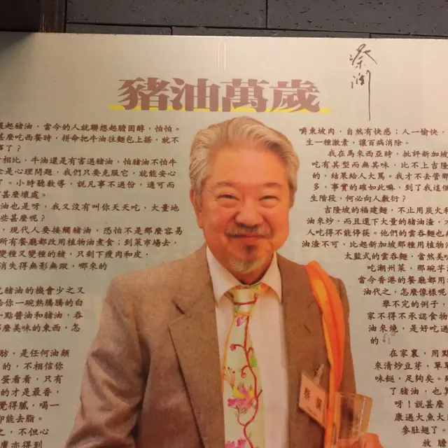 去到門口,門頂那幅黑底金字的牌扁故然搶鏡,甚有電視台古裝戲內客棧飯店的風味;更大賣點卻是掛在門口左邊、裝裱起來的題字:「天下第一炒朱什   蔡瀾推薦」。蔡瀾是誰,作為香港饞咀一族,冇可能未聽過吧?雖然近十年轉趨低調,但之前卻是香港資深電影人兼食家、更是娛樂圈及傳媒界的第一代日本通。印像中「粗菜館」在20年前左右開業時,蔡瀾先生已經親筆提字推薦,但當年卻並沒有在他主持的電視節目或執筆的雜誌專欄出現;到底蔡瀾先生與「粗菜館」有什麼淵源?