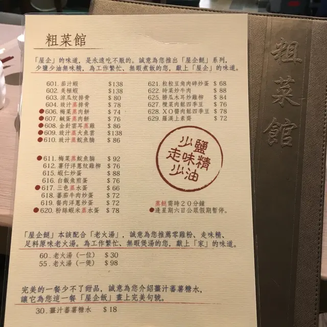 「粗菜館」,名字開宗明義講明餐廳所賣的是「粗菜」,並非大魚大肉、鮑參翅肚、游水海鮮之類的貴價菜式。當然,所謂「粗菜」只是以今時今日的標準而言,其實是指一些懷舊風味小菜;如果真的全部只賣幾十年前香港勞動階層的「粗茶淡飯」式下欄餸菜,應該不會有太多人幫襯。記得多年前第一次幫襯是佐敦老店(備註:早前結業後在同一個地址又重開了,但名字開首多了兩個字,到底是否同一個老闆?),特色小炒印像深刻;多年後再度重臨,味道是否依然?