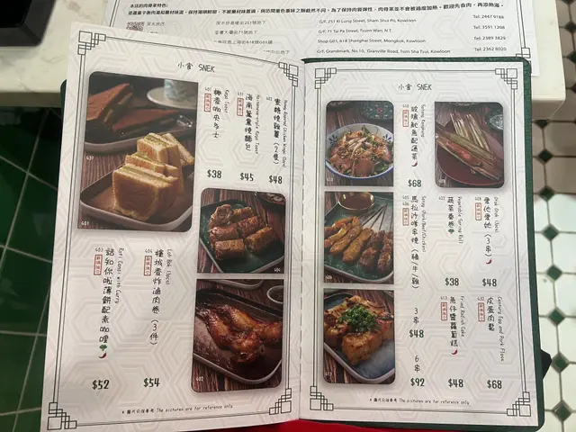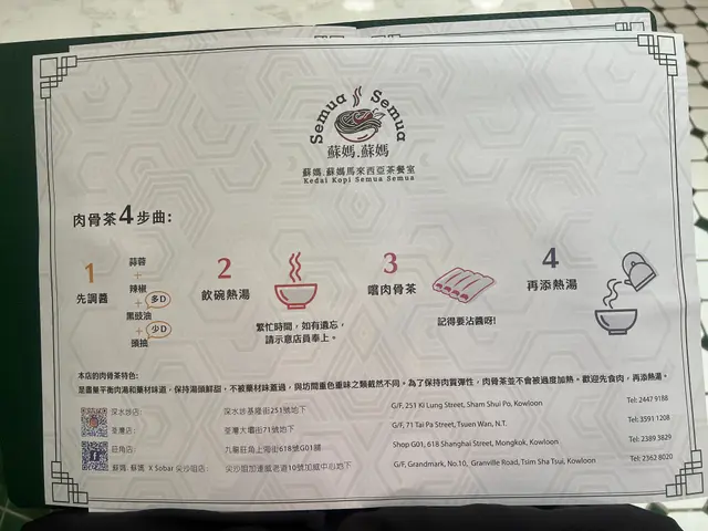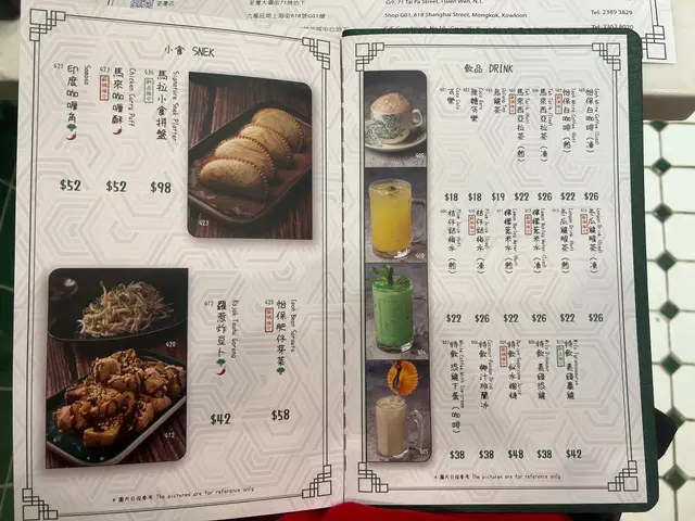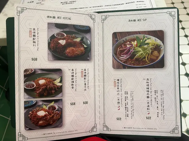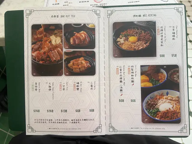 餐牌:主菜,肉骨茶,撈粉麵,湯粉麵,辣死你嗎,咖喱,小食,甜品,飲品
