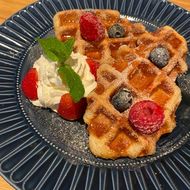 嘩,呢個甜品認真絕,好後悔之前幾次黎都冇叫到。牛角包窩夫好特別,窩夫形狀🧇但係有牛角酥🥐既鬆脆口感。超重牛油香味,再係上面灑左啲糖粉,仲可以加埋水果同埋忌廉一齊食添。