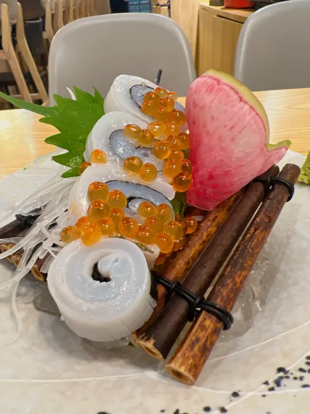 包著一小卷的魷魚再𠝹花 面上再加上魚籽 入口膠質滿滿的 在口中爆開 分外興奮