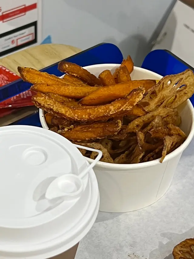 一份Mixed Fries 𥚃面有三款不同的炸物 薯條🍟、蕃薯🍠條、蓮藕片