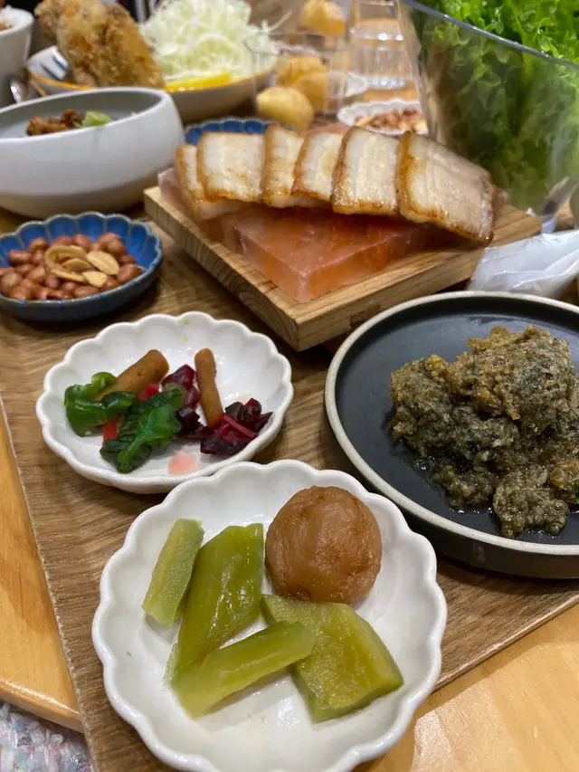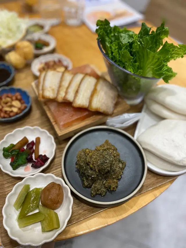岩鹽咸豬肉拼皮蛋醬生菜包 配蒸刈包