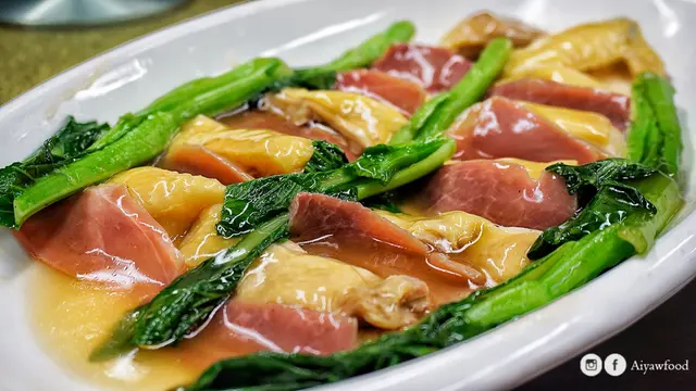 火腿脂肪分佈平均,味道沒想像中濃烈,即便雞胸位置算是滑溜不難入口,意外是一旁裝潢的菜芯也相當清甜爽脆。