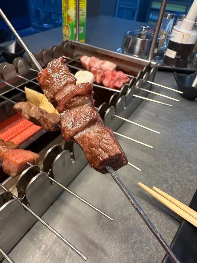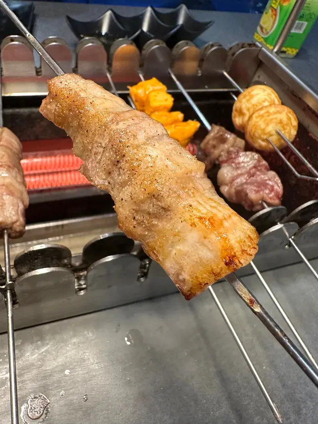 牛有M6和牛牛柳、紐西蘭牛西冷、牛舌同美國牛肋腩!四款都係唔洗加錢嘅任點串燒,其中牛舌最正,厚切如骰仔般,一啖一粒,入口軟腍有彈性。