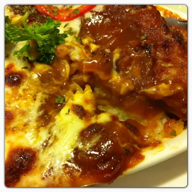 賣相吸引,剛奉上時可看到茄汁仍在沸騰,可見食物焗得相當熱。飯面滿佈茄汁,味道濃郁中又帶點酸甜。有少許芝士作點綴,但芝士味不太濃。豬扒亦烹調得很出色,表面沾過薄薄的蛋漿微煎,香口有口感,肉質亦嫰滑,味道不錯。整個飯焗得透徹,由外至內亦熱辣辣,但若是炒飯底相信更美味。