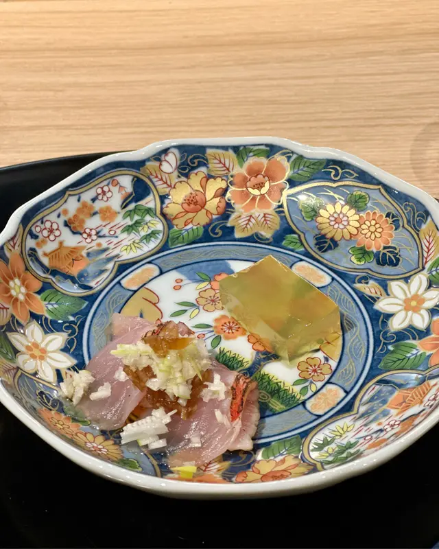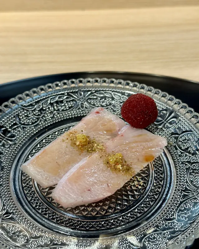 鰤魚配上芥末、芝麻碎及山桃漬,魚肉帶少少爽口之餘幾油潤,芥末及芝麻碎幾脆配搭得宜。