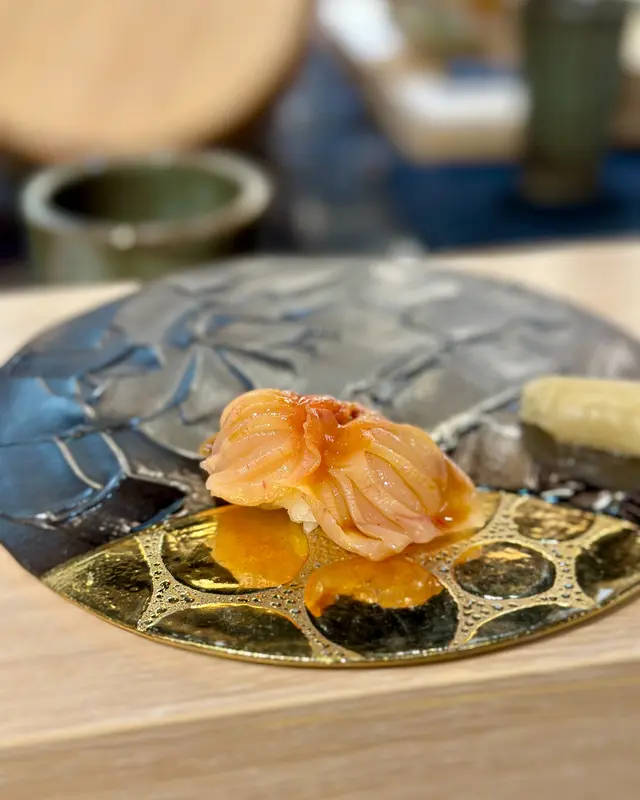 赤貝壽司有柚子皮點綴,新鮮嘅貝類爽度特別高。