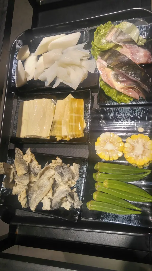 包括有我喜愛的肉類 牛柏葉,美國肥牛,鮮豬潤,鯇魚腩,鮮魚頭 及脆肉鯇.......等,鮮腐竹,甜粟米,炸魚皮,養身秋葵........等。新鮮蔬菜,甜品及十多款飲品,可於自助區自取。