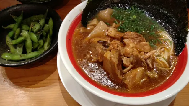 碗炙燒豚角醬油拉麵,先講賣相,都ok嘅,幾多肉,麵嘅分量相對較少,淨係食碗麵會唔多夠飽。個湯一啲醬油味都冇,係。一。啲。都。冇,得辣味,但餐牌冇寫明碗拉麵係辣嘅,完全唔明咩事,淨係得個辣字,冇其他味道,冇任何層次可言,食拉麵期待果種骨湯湯頭嘅鮮甜濃厚完全做唔到