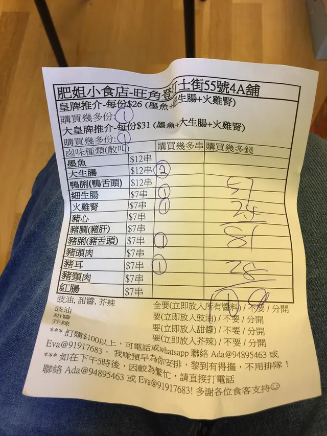 買滿$100不用排隊 肥髀媽等级42018-08-16417 浏览 关注 食完晚餐去朋友家玩,經過肥媽見到啲鹵味好靚,忍不住又排隊,呢間永遠有人龍,簡單一間小店,一知大雪櫃,今次人多食,發現有另一條隊係$100以上,不用串,可以劃票落單!我哋即刻攞張餐紙落單,店員好快切好比我哋!1去到朋友家打開,發泡膠盒滿滿一盒,鮮橙色鹵味!好吸引,仲比晒所有醬!鹵味盛宴外賣醬汁皇牌推介($26)墨魚、細生腸、火雞腎,大皇牌推介($31)墨魚、大生腸、火雞腎,大生腸($12/串)加了2串,細生腸($7/串)加了一串,豬脷($7/串)加了一串,豬耳($7/串)加了一串,橙色鹵味好彈牙又唔會韌,尤其喜歡大細腸(超喜歡腸)嘅咬口,墨魚嘅𡁻口!仲有啲醬汁畫龍點睛,吊出鹵味嘅味道,黃芥辣攻鼻,加淋上去嘅甜豉油!好好味呀~~~店員們分工合作,極快手出菜,就算排隊都不用太耐買得多唔使排!👍🏼以上食记乃用户个人意见 , 并不代表OpenRice之观点。1分享買滿$100不用排隊 肥姐小食店 https://s.openrice.com/QrLT0sxWl00检举 张贴 评分5味道3环境3服务3卫生3抵食推介美食外賣醬汁鹵味盛宴用餐日期2018-03-05用餐途径外卖自取人均消费$109 (宵夜)