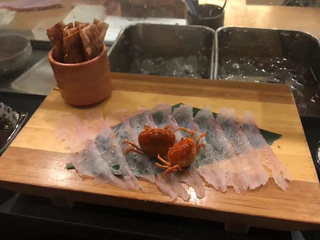 真係冇諗到,頭先第一時間吸引到我注意的,馬上就派上用場,成為我口中美饌,在一片片赤羽太刺身之中,兩隻小蟹,活成為左一片如畫的景象,就好似緩浪之中,兩隻小蟹向前走