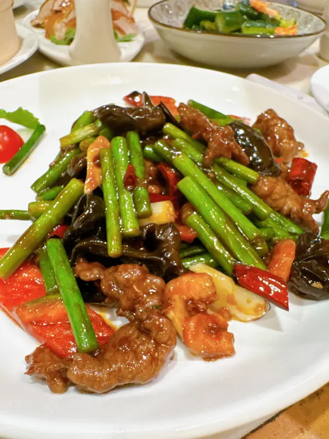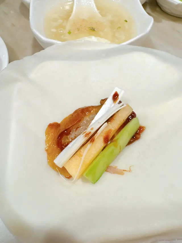 首先,我選擇了北京填鴨。鴨皮烤至金黃酥脆,脆皮與肉質的完美結合令人陶醉。滲透著甜麵醬的鴨肉,帶來層次豐富的口感和香氣。每一口都是一次奢華的享受,令人難以忘懷。