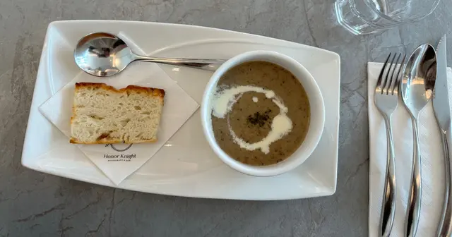 麵包香脆鬆軟,蘑菇湯質感濃稠,帶有蘑菇蓉,味道濃郁,伴著忌廉的香滑。