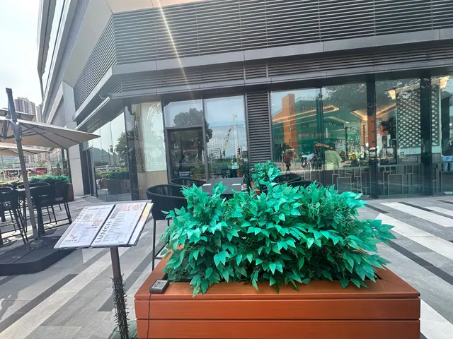 餐廳外觀時尚,四周落地玻璃,也有室外座位。內裡冷氣充足,光線明亮,牆上掛著玩味掛畫。