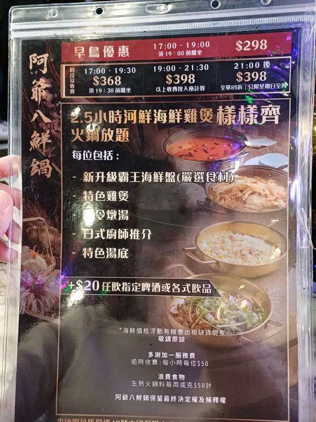9點後收費$398,+$20可以任喝啤酒汽水,埋單還有85折,任食雞煲/河鮮/海鮮打邊爐,海鮮真的很新鮮,即點即從魚缸取出處理再上桌。