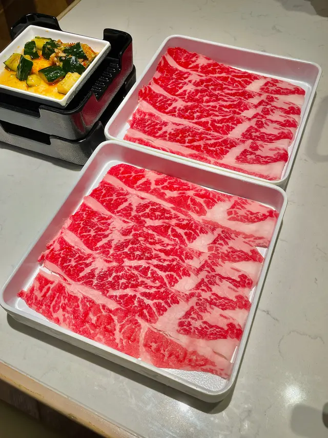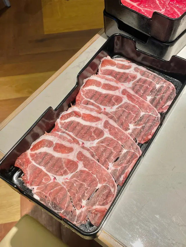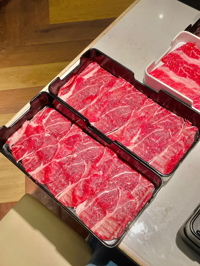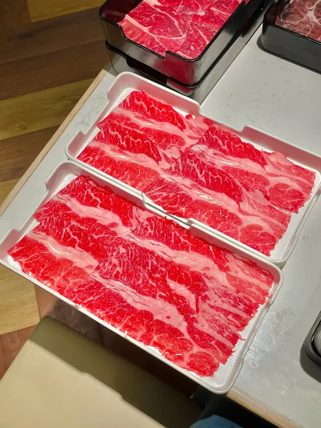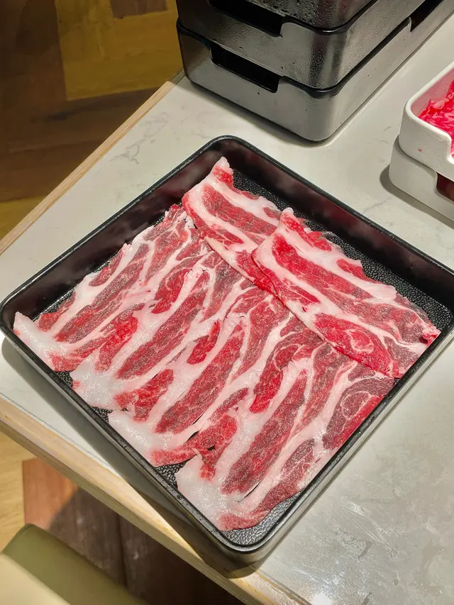 火鍋肉品(跟餐$0),包括有極級Prime Grade安格斯牛頸脊、Prime Grade美國安格斯牛肉、西班牙無激素豬肉片。