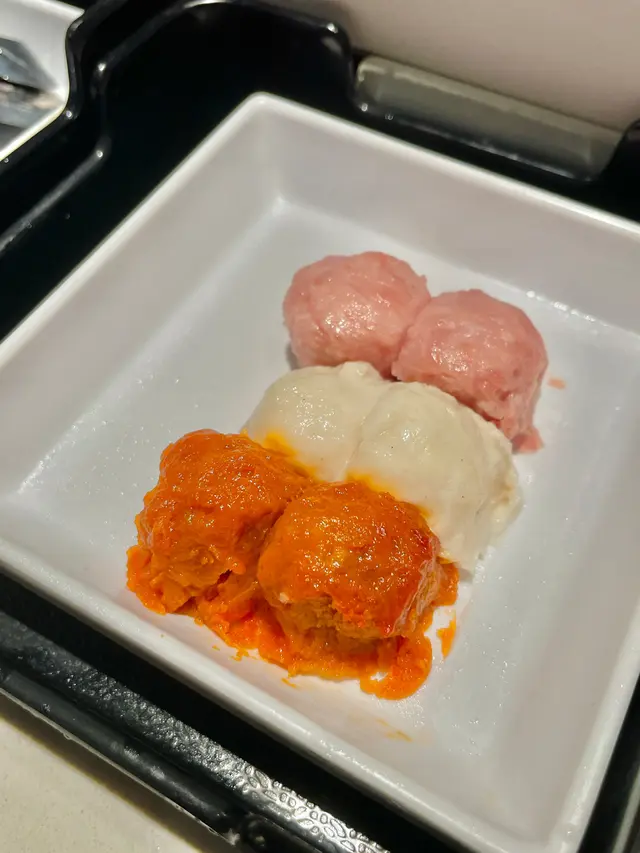 火鍋配料(跟餐$0),包括有手工三寶丸、墨魚腐皮卷、墨汁香腸、芝心包流心、台灣鴨血、番茄、稻庭烏冬。
