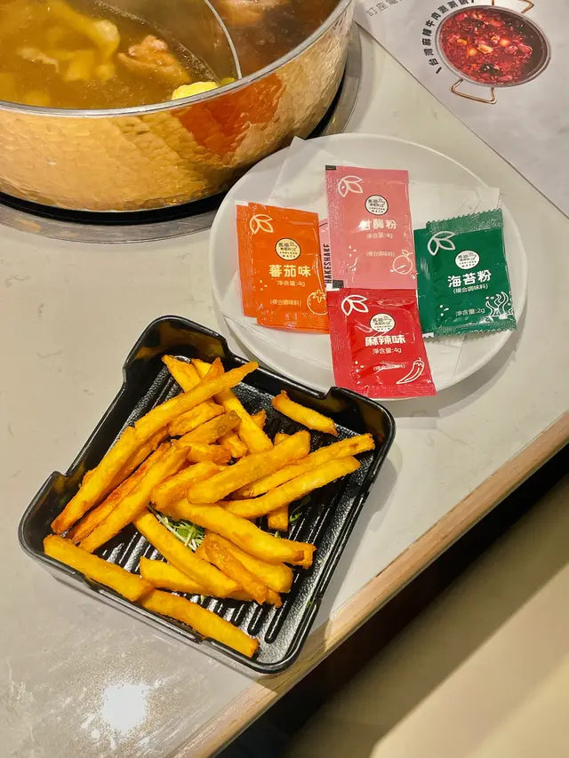 黃金地瓜條(跟餐$0),口感酥脆,配以番茄味複合調味料食用,味道酸甜。