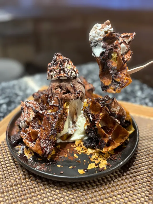 🍫 切開細細件三角形完美沾滿cream同醬🤤 窩夫入面有流心朱古力漿,面頭有朱古力脆脆同威化、朱古力雪糕,食落去勁香濃勁甜但完全唔膩的🤤